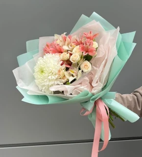 "История любви" - это изысканное сочетание кустовых роз, альстромерий и хризантемы, представленное в элегантной упаковке. Каждый стебель окутан таинственностью непостижимого месячного света, который придает цветам уникальный шарм и загадочность. Здесь прекрасно сочетаются нежность и страстность, классические линии и элегантность. Букет "История любви" олицетворяет изысканность и истинное великолепие природы, которые способны овладеть сердцами и превратить любой момент в стильное и роскошное событие.
