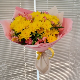 Ощущая нежное прикосновение первых лучей утреннего солнца, этот букет словно окутывает своим теплом и нежностью. Желтые воздушные хризантемы притягиваются к свету, создавая атмосферу радости и оптимизма. Нежные альстромерии, словно мягкие облака на небе, добавляют воздушности и изысканности композиции. Букет, оформленный в крафтовую упаковку, придает ему естественность и некую загадочность. Испытайте чарующую магию этого букета и подарите его любимому человеку, чтобы принести в его жизнь тепло и счастье.